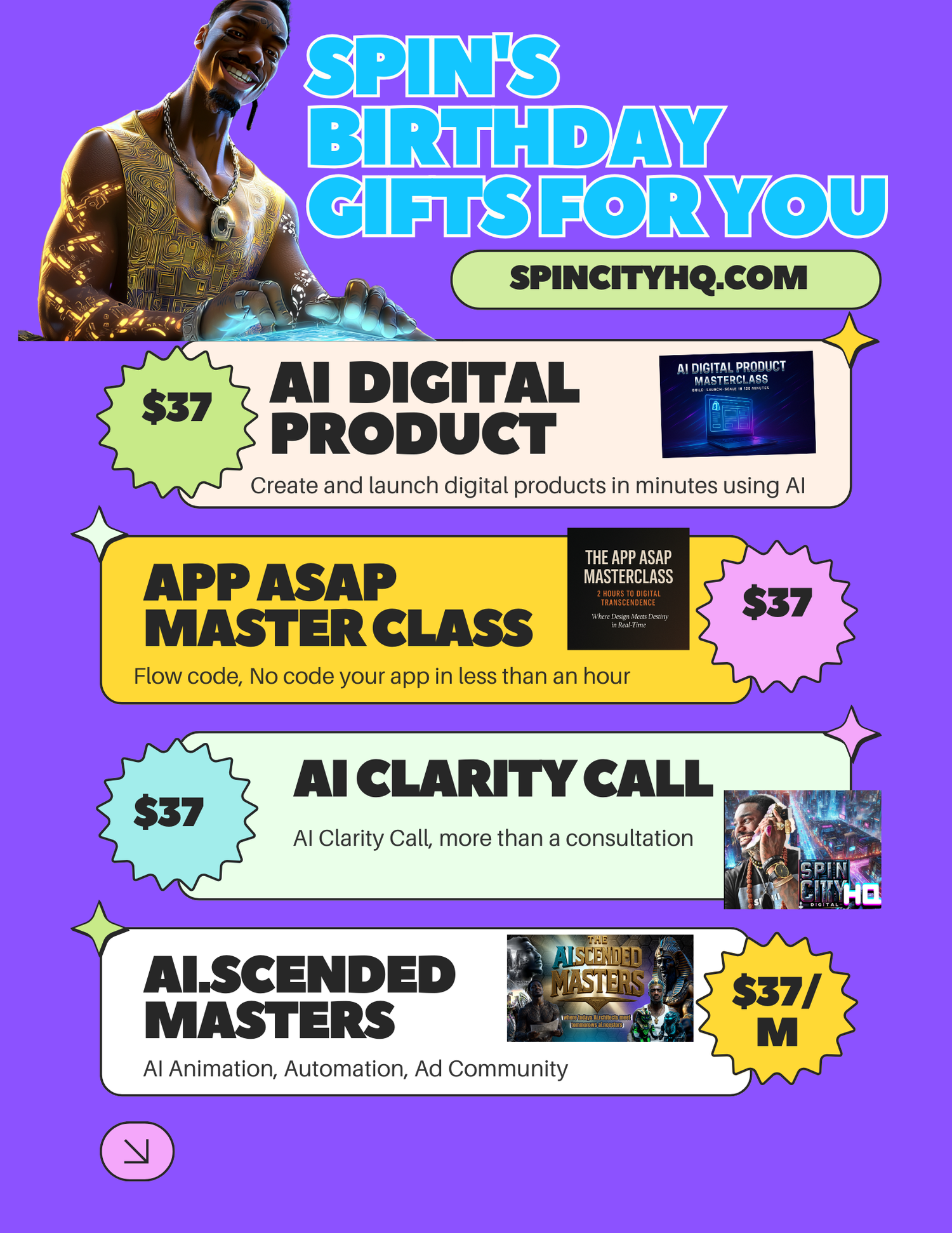 Peace to the brotha Spincity! The AI Digital Product Masterclass was highly successful I love how our good brotha Spin took his time with the step by step and Q&A’s. He threw us a lot of additional packages with this purchase I’m already working on my digital product with the AI tools.